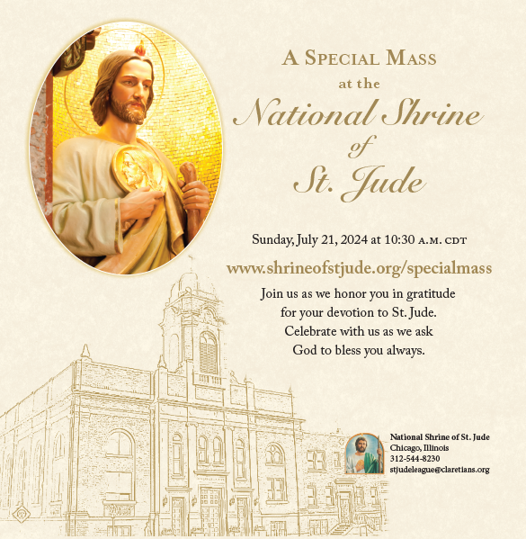The National Shrine of St. Jude hosts a special Mass for Benefactors each year as a way of saying thank you to all the devotees and supporters of the Claretian Community Impact (CCI) who help us carry out our ministries of faith, healing, and hope. The special Mass for this year is scheduled for July 21st at 10:30 am at Our Lady of Guadalupe Parish, home of the Shrine.